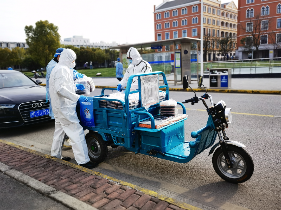 为全面落实校内疫情防控工作要求,学院及时组建了以师生党员为主体的抗疫志愿者小队。志愿者小队团结互助、高效合作,除了完成核酸检测秩序维护、楼宇日常管理、宿舍卫生清扫、各类物资运送等工作,还要承担起每日近三千份餐饮送递任务。“一日三餐,一餐不能少,一刻不能晚”,从食堂排队、饭菜分装、餐袋装车、路途运送,再到餐袋卸货,他们在食堂与楼栋之间争分夺秒,全心投入,第一时间将热腾腾的饭菜、整箱的水果送到各个楼栋摆放整齐。学院所有思政教师进驻宿舍楼栋,奋战一线,始终陪伴在同学们的身边,有效提高了管理效能。